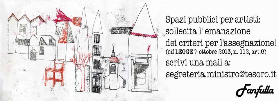 È proprio da questa volontà che il Fanfulla si fa promotore della campagna di comunicazione #Spaziagliartisti, per informare e rendere partecipi amici, artisti, associazioni e cooperative presenti in tutta Italia, del Decreto pubblicato dal Ministero ai Beni Culturali e che prende il nome di ‘Decreto valore cultura’, poi convertito in legge a ottobre 2013, nel quale viene tra l’altro prevista l’assegnazione di immobili di proprietà dello stato ad associazioni e cooperative di artisti ad uso atelier, pagando un canone simbolico di 150 euro per 10 anni e varie altre agevolazioni. Il 7 gennaio si sarebbe dovuto rendere pubblici i criteri di assegnazione e il bando di gara. Ma questo non è successo.